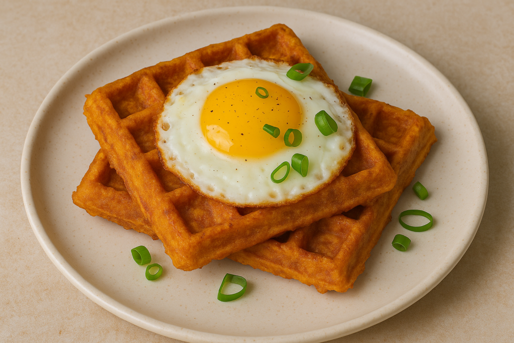 This vegetarian sweet potato waffle recipe is hearty, savory, and satisfying — perfect for a weekend brunch or a light dinner. Topped with a fried egg and fresh scallions, it’s full of flavor and texture, all without the bacon.